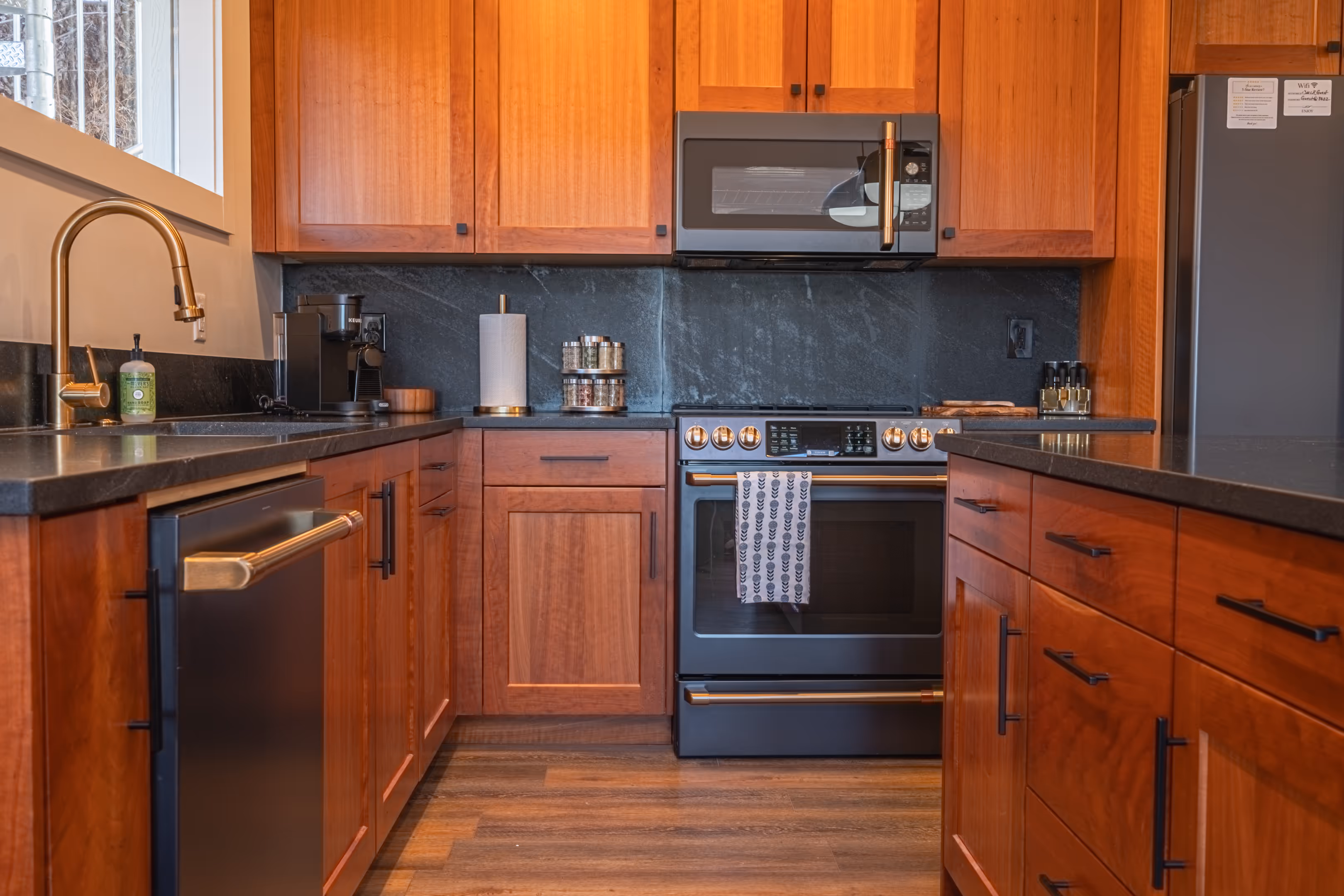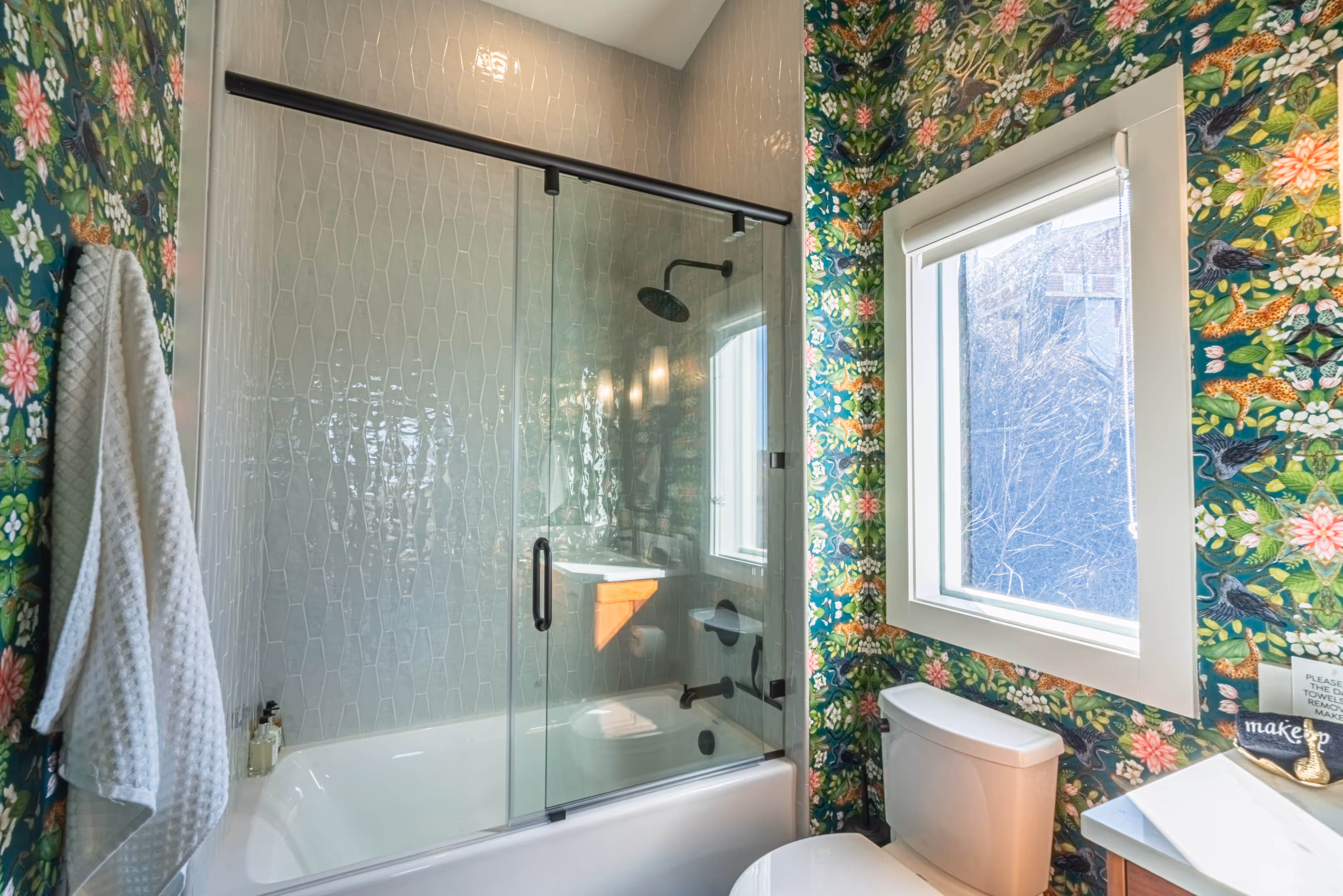 Nestled in Sevierville, Tennessee, this luxury Airbnb blends eclectic charm with modern refinement. Bold patterns, rich textures, and curated furnishings create a vibrant yet elegant atmosphere, from the jungle-inspired wallpaper in the powder room to the geometric guest shower tile. The open-concept kitchen and living areas feature warm wood finishes and striking accents, while the loft offers a cozy retreat with custom seating and a shuffleboard table. Thoughtfully designed for both function and beauty, this Smoky Mountain escape sets a new standard for luxury vacation rentals.